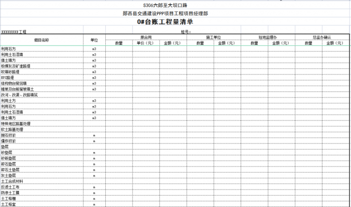 一個(gè)項(xiàng)目或一個(gè)合同段的臺(tái)賬由n條可以獨(dú)立計(jì)量的工程結(jié)構(gòu)(單元)組成,一般情況下一條臺(tái)賬應(yīng)包含子目號(hào)、子目名稱、單位、工程數(shù)量、單價(jià)、合價(jià)、里程樁號(hào)、工程部位描述、圖紙編號(hào)、備注說明等。